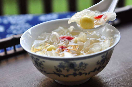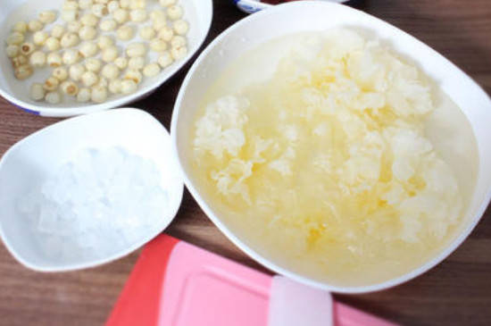 新鲜银耳用清水泡开后,剔除泛黄的硬结并撕碎备用,莲子剥出里面的芯,之后往锅内加适量清水,再往锅内放入银耳、冰糖、红枣、枸杞,开火加热煮沸后不断搅动,煮开后小火熬煮。最后放入莲子熬煮片刻,银耳胶化、汤汁浓稠时就可以食用。