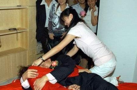 到了婚礼当晚,一对新人早已端坐在新房里。一帮同学涌进了新房,大家把新娘和新郎围在了中间,先按住他们的手脚,七手八脚地用事先准备好的粉彩给他们画了两个大花脸,那脸谱比喜剧里的还夸张呢。之后,大家又拉扯着两个新人做了一些高难搞笑动作,逗得大家哈哈大笑,新房顿时多了不少喜庆的气氛。