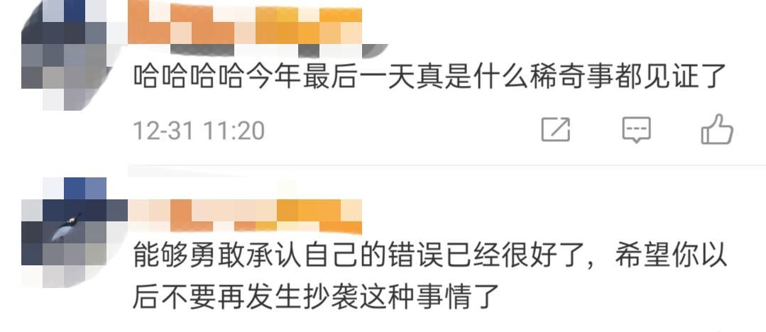 这也让不少网友纷纷表示"能够勇敢承认自己的错误已经很好了,希望你以后不要再发生抄袭这种事情了",还有网友则直呼"哈哈哈哈今年最后一天真是什么稀奇事都见证了"。