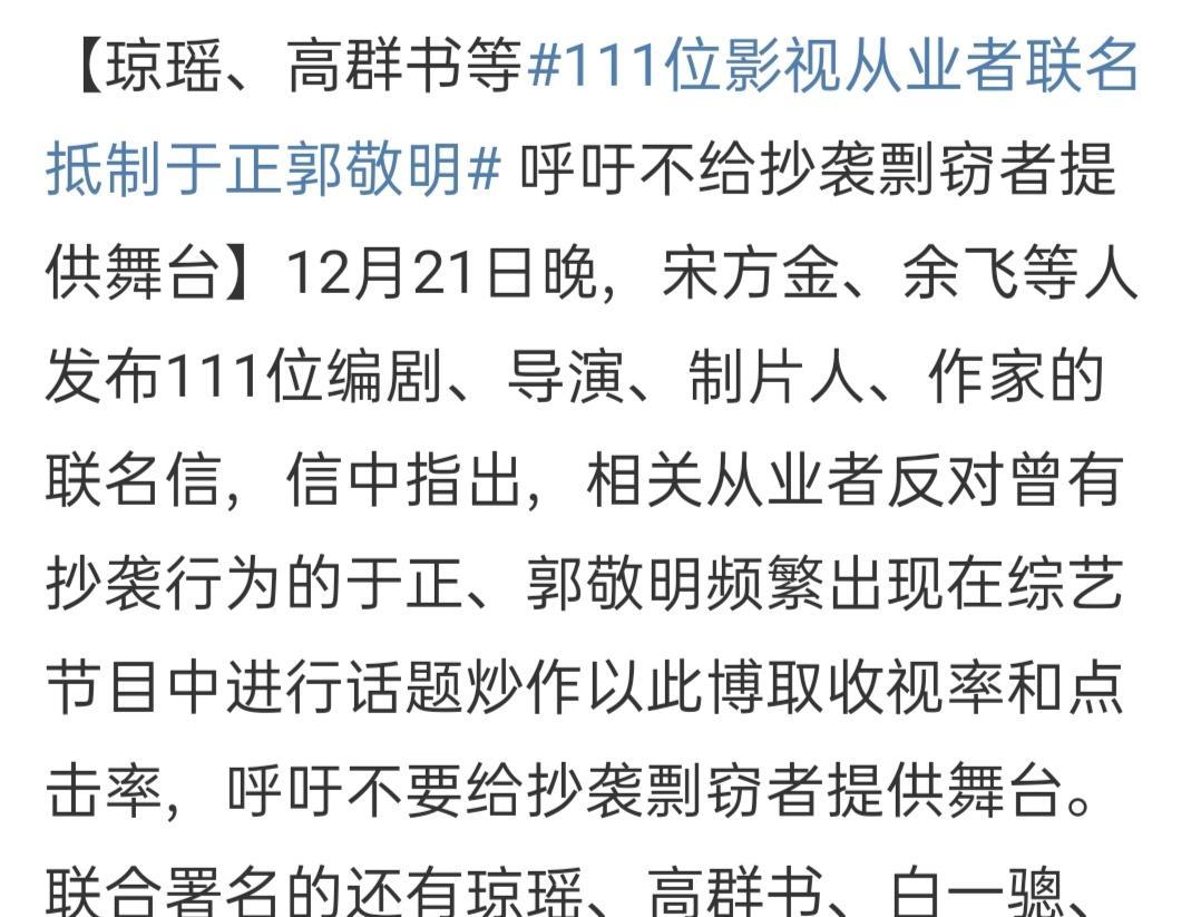 而在今年12月21日晚上,琼瑶等111位编剧、导演、制片人、作家发布联名信抵制于正与郭敬明,认为他们频繁出现在综艺节目中进行话题炒作以此博取收视率和点击率。
