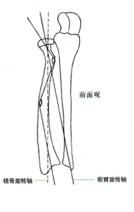 首先让我们再分析一下前臂的旋转运动模式,桡骨围绕桡骨小头至尺骨茎突连线组成的轴线旋转。