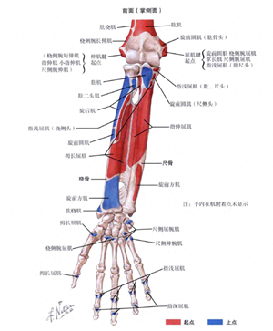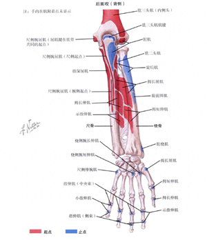 我们仔细观察会发现,他们都在轴线上或非常接近轴线,力矩太小而不能产生有效的肘关节屈伸运动,因此,我们不把他们列为控制肘关节活动的肌肉。