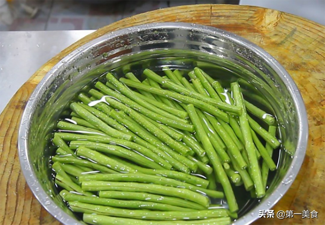 准备长豆角一把,清洗干净,切掉两头再切成长段,放入清水中,加入一勺食盐浸泡一下,