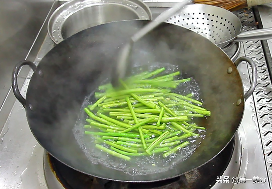 锅内烧水,把豆角放入锅中,大约煮2分钟,把豆角煮熟,倒出豆角沥干水分备用。