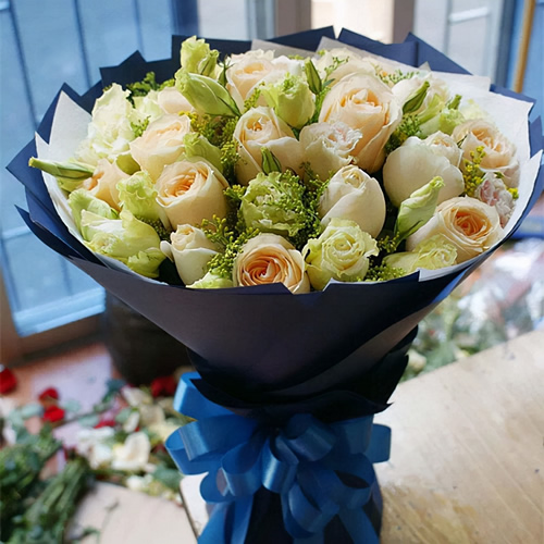 玫瑰鲜花在色系上有两大美,一个是众所周知、人人皆爱的红玫瑰,另一种则特别的低调。她就是淡雅而高贵的香槟色玫瑰,香槟玫瑰的颜色与香槟的颜色很近。香槟玫瑰的花语是爱上你是我今生最大的幸福。代表了自己的爱一心一意,是用来求婚以及婚礼时候的花卉。香槟玫瑰非常适合用来送给温柔沉静的女孩子,除了代表爱情,它还有一个花语是心想事成,可以赠送它来祝福友人。