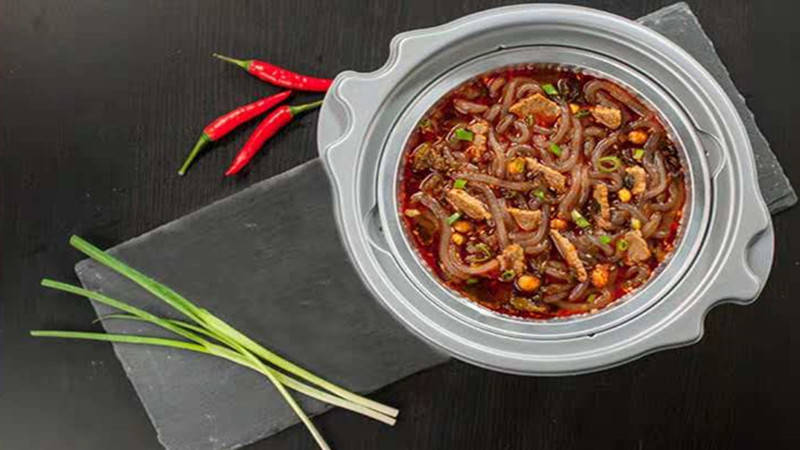 食材放入铝箔餐盒并加入适量饮用水;倒入底料和主食并加饮用水至刻度线;撕开发热包外包装,放入底层盒子;加冷水至注水线,上层餐盒放入盒中并盖上盒盖;15分钟后即可享用。