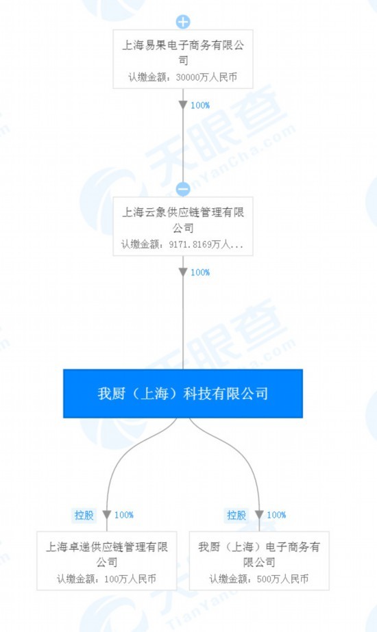 天眼查数据显示,我厨的运营主体为我厨(上海)科技有限公司,成立于2014年12月,注册资本约9172万人民币,经营范围包括食品生产,食品销售,销售自产产品,食用农产品(粮食除外)的批发等。公司由易果生鲜的运营主体上海易果电子商务有限公司全资控股。