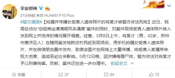 近日,我局在侦办“空姐乘坐滴滴顺风车遇害”案件的同时,对案件现场受害人遗体照片被人发到网上并流传的情况展开调查。经查,5月8日上午,肖某才(男,42岁,郑州市惠济区人)在随同案发地附近村民赶到现场后,用手机拍摄女受害人遗体照片,并在微信朋友圈中发布,致使该图片在网络上大量传播,给受害人家属带来极大伤害,造成恶劣社会影响。5月12日晚,因涉嫌侮辱尸体,警方依法对肖某才予以刑事拘留。目前,案件还在进一步办理中。