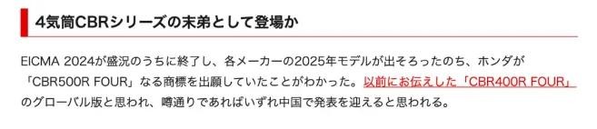 看来之前本田官方提到的四缸中排车型,就是这台CBR500R FOUR,而不是CBR400R FOUR。