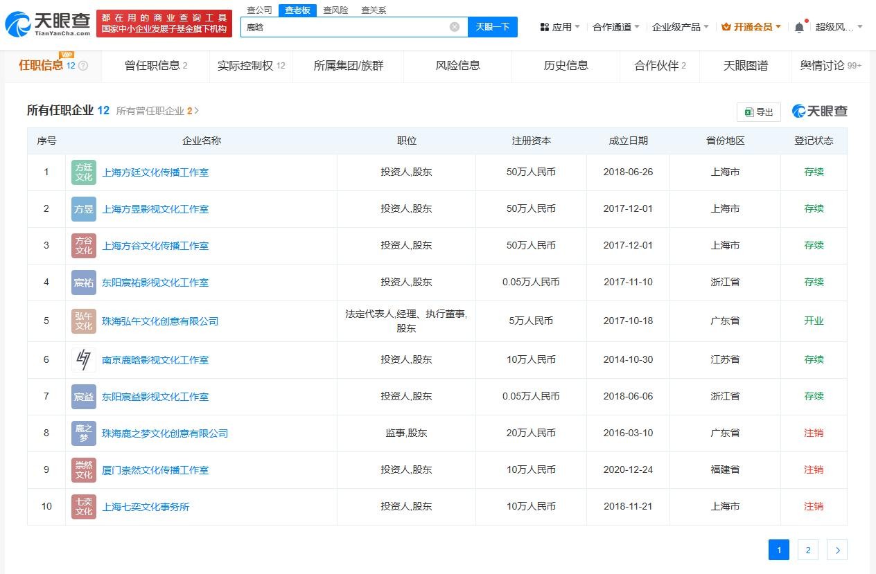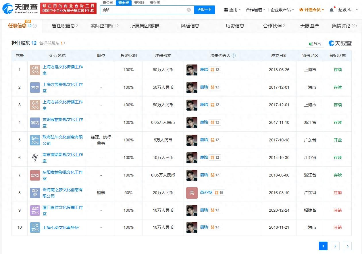 天眼查商业履历信息显示,鹿晗名下关联12家企业,其中7家为存续或开业状态,包括上海方廷文化传播工作室、南京鹿晗影视文化工作室、珠海弘午文化创意有限公司等,上述企业均由鹿晗个人全资持股。