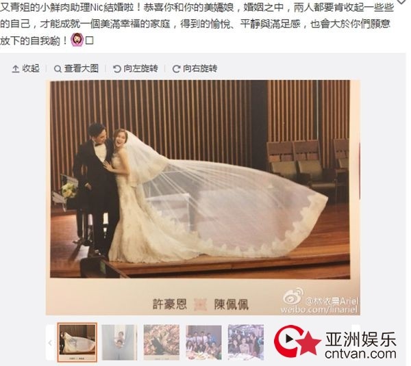 今日凌晨,林依晨还送上了真挚的祝福:“又青姐的小鲜肉助理Nic结婚啦!恭喜你和你的美娇娘,婚姻之中,两人都要肯收起一些些的自己,才能成就一个美满幸福的家庭,得到的愉悦、平静与满足感,也会大于你们愿意放下的自我哟!”