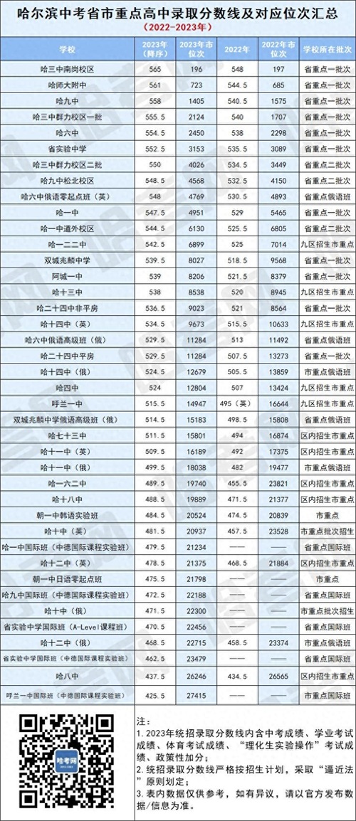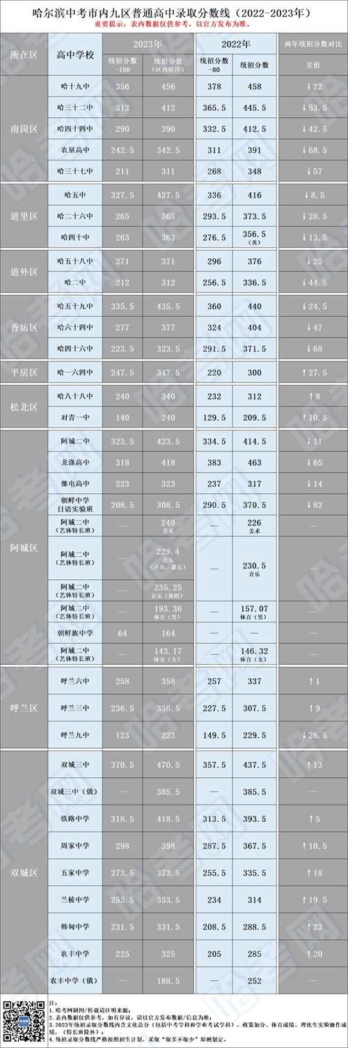 近日,哈尔滨市内九区普通高中分数线陆续出炉。截至目前,哈尔滨2023中考省市重点高中、民办高中、普通高中录取分数线均已公布,中考录取基本结束。本文将发布过的各批次分数线进行汇总,方便2024中考家长们参考。