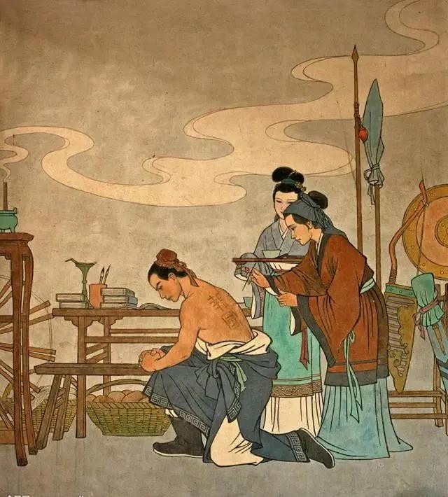 在岳飞十五六岁的时候,宋朝的当权者腐败无能,北方的金人向南入侵,节节败退,国家正处于一个生死存亡的关头。有一天,岳母把岳飞叫到她面前对他说:“现在国难当头,你有没有什么打算呢?”岳飞大声告诉母亲说:“要到前线去杀敌人,精忠报国!”岳母听了儿子的话决定把“精忠报国”这四个字刺在岳飞的背上。岳母首先是在岳飞的背上写了“精忠报国”这四个字,然后又用绣花针刺起来,最后又涂上醋墨。从此,“精忠报国”这四个字就永远留在了岳飞的背上。