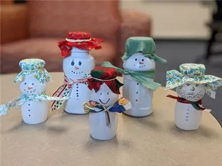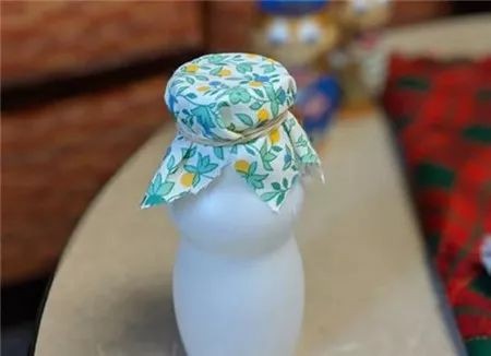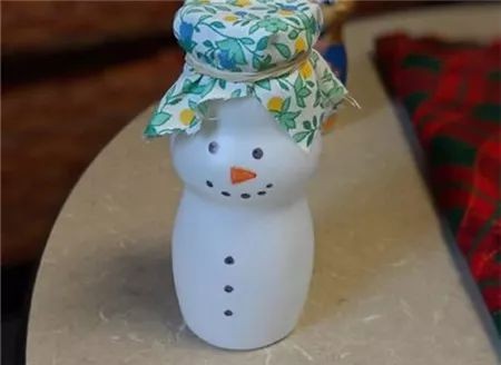 用彩笔在瓶身上画出雪人的眼睛鼻子嘴巴以及身上的纽扣,利用其它颜色的花布制作出雪人的围巾,如图完成即可