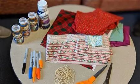 准备好需要的材料,彩色的废弃布料,剪刀,橡皮筋,彩笔和废弃塑料瓶;将塑料瓶身上面的包装去掉擦干净,剪一小块花布,将其用橡皮筋扎在瓶口处,如图