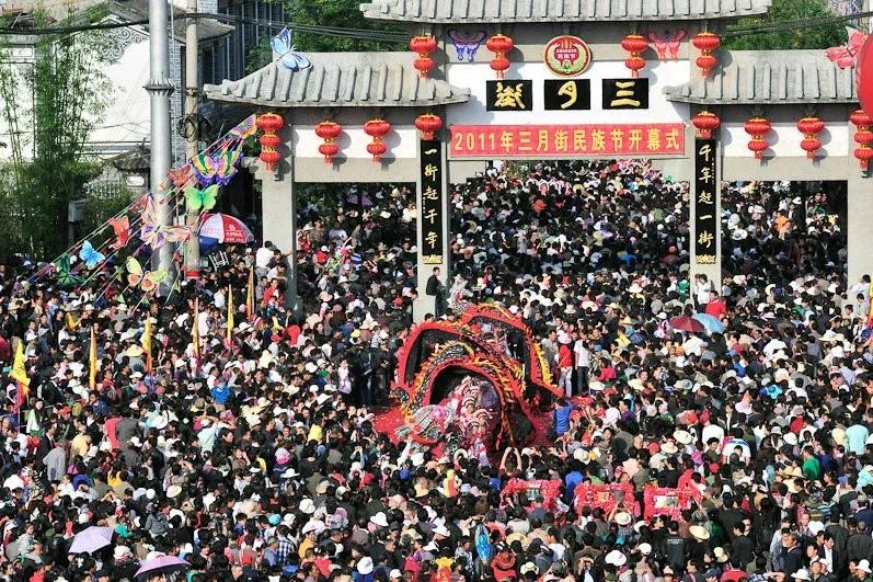 白族每年三月举行5-7天贸易集市。据传始于唐代,是纪念观音升天、信徒云集于此而形成的佛教集会。