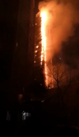 从现场画面可以看到,火势从低层向高层迅速蔓延,楼的外墙体及保温材料出现掉落。