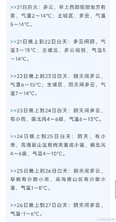 今天阳光继续加班,成都最高气温14℃。晴暖背后,寒潮却在悄然逼近:预计24~27日,四川省大部地方日平均气温将累计下降5~8℃。四川多地将迎大降温,成都日平均气温累计下降5~7℃,最低气温低至-1℃。(成都气象、成都发布)