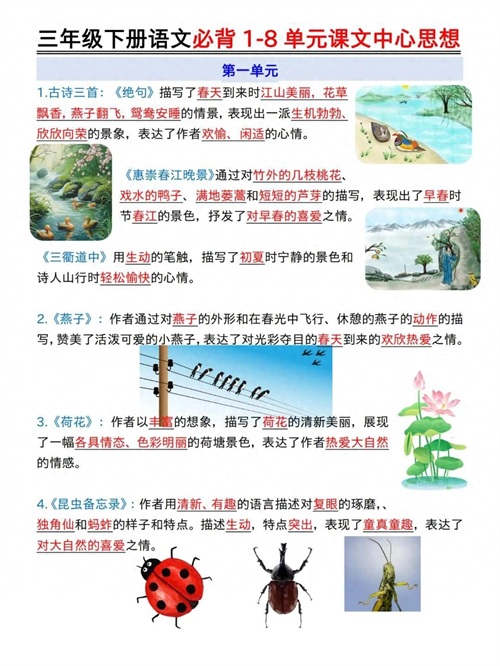 三年级下册语文必背1-8单元课文中心思想