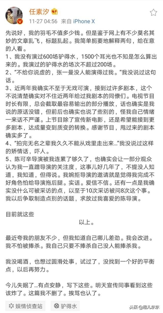 任素汐表示“我没有演过600场《驴得水》,1500个耳光也不知道是怎么算出来的,演《驴得水》的场次不超过200场,最近框我的朋友不少,但我知道自己哪差劲,我会改进”。