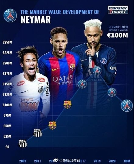 【29岁内马尔身价已降至1亿欧 两年贬值8000万欧】德国《转会市场》更新了法甲球员身价,内马尔的身价继续下滑。内马尔在巴萨时期的身价最高为1亿欧元,之后便在17年夏天以2.22亿欧转会巴黎。内马尔在2019年6月的身价一度攀升到最高点,达到了1.8亿欧元。但自那之后,他的身价便持续下滑,两年内已经缩水了8000万欧。不过,内马尔如今仍然在全球球员身价榜中位列第4,他同时还是巴西籍球员和左边锋位置的身价榜首,不过在法甲和巴黎队内都落后于姆巴佩。