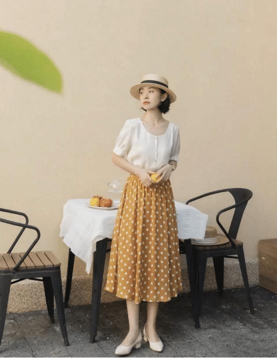 白色的上衣十分的素雅简洁,和卡其色的波点裙子搭配相得益彰,整体上显得人十分的优雅大方有气质,远远看上去更有几分小女人的味道。将40岁女人应该有的气韵展现的非常完美。