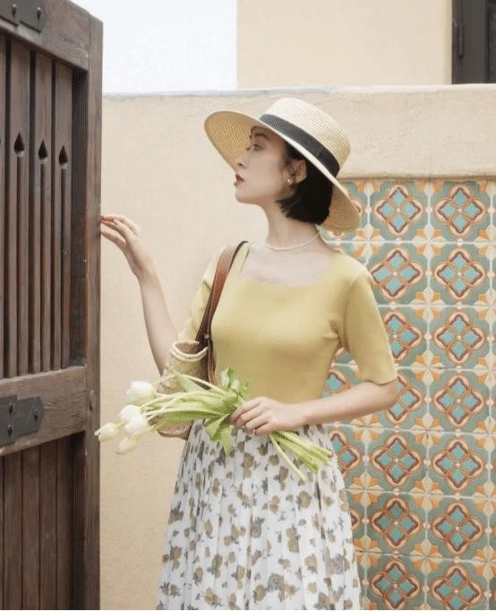 身材没有因为年纪变形走样的女性可以非常适合这套穿搭。紧身的上衣完美的勾勒出身材曲线,展现出在这个年纪让人不敢相信的身材,惊艳了时光和你的眼。方领的设计削减了上半身的厚重感,更显纤瘦,特别是精致的锁骨和饰品搭配,还有几分少女的精致感。带玫瑰花的白色半身裙有着生活的气息,将你热爱生活的气质显露无遗。