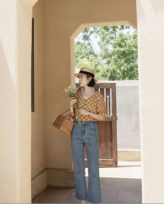 沉香般的卡其色有一种时代的厚重感,衣服上的波点就像是经历的数个日日夜夜般和时代相融合,有着经久不绝的淡香,将成熟女人的魅力衬托的十分到位。V领的领口露出光洁的皮肤和精致的锁骨,凸显好身材。高腰的喇叭裤将细长的双腿修饰的很有型。整体上看上去有几分少女的感觉。