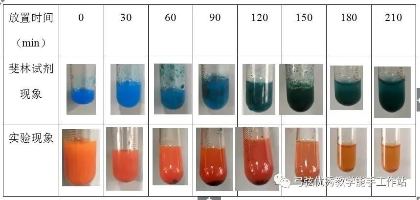分析原因:新配置的Cu(OH)2溶液呈悬浊液,与还原糖反应最充分,砖红色的Cu2O生成也最多,均匀饱满的分布在溶液中。放置后的Cu(OH)2溶液,一方面会发生沉淀,影响与还原糖的接触面,另一方面Cu(OH)2自身发生分解反应,生成CuO黑色沉淀。这两个原因都会影响砖红色沉淀生成的量和分布,导致反应后的溶液中存在有少量的Cu2O沉淀,蓝色Cu(OH)2沉淀,以及CuO黑色沉淀,它们混合在一起,就出现了图片中的30-150min时的实验现象。