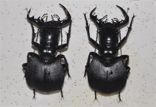 性二型性:雄性头部硕大,下颚发达,用于固定住雌性的宽颈进行交配(雌性前胸下部正好有凹槽,可以和雄性的下颚耦合),同时能够防御其他雄性插足。而雌性体型较小,头胸部和口器均不发达。