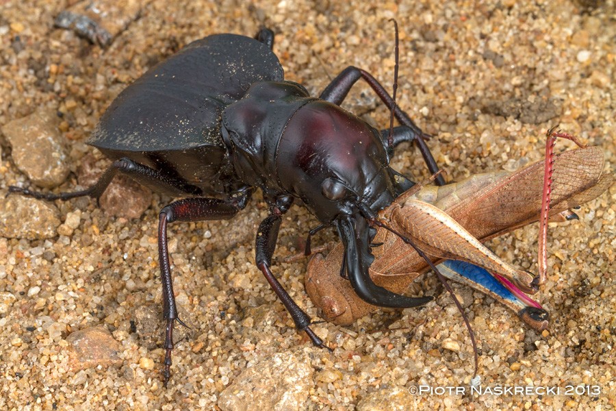 捕猎行为:尽管体型巨大,但大王虎甲的行为方式与较小的虎甲非常相似。它的动作敏捷,能飞快地奔跑和瞬间改变方向,但它们不会飞。这些甲虫捕食任何会动的东西,主要以地表节肢动物为食,特别是蝗虫、蟋蟀、白蚁和蜘蛛。与其他虎甲虫不同的是,大王虎甲的视力很差,它们搜索猎物主要是依靠嗅觉。一旦嗅到猎物的气味,它逐渐变得兴奋起来,用巨大的下颚咬住猎物,毫不夸张地将其撕成碎片。我曾看到它找到并杀死了一只大狼蛛,一开始我以为狼蛛会有一番反抗,但大约两秒钟后,狼蛛只剩下了一团被遗弃碎屑组织和一小堆腿。主体被吃掉后,甲虫把腿一个接一个地从地上捡起来吃的干干净净。