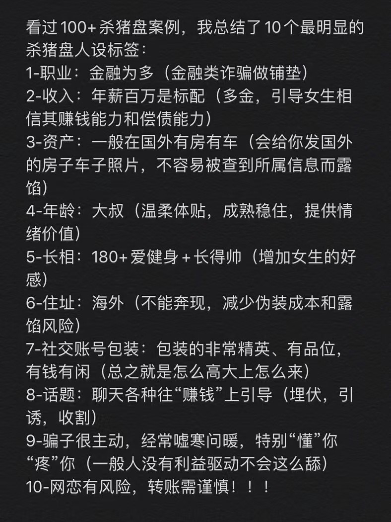 原来看杀猪盘报道都会觉得这些女孩太不小心,直到自己接触了一个,现在的杀猪盘比大家想象的还要有城府,水平要高。我知道的这个潜伏了两年(有可能是养鱼杀猪)偶尔会聊几句,水平很高,反应很快,什么话题都接的上,绝对不是个low货,我是对他身份一点不怀疑的,但是最后还是让我找到了破绽。这些人真的是为了骗钱耐力十足,刷新我三观!!