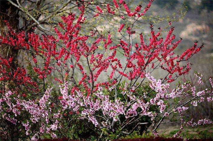 夹岸云霞岭染彤,桃花涧水瓣飘红。
