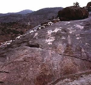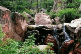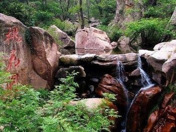 注:桃花涧景区,位于江苏连云港海州区锦屏山南麓。桃花涧山水俊秀、风景优美,素有“苏北九寨沟之称”,三十六景遍布其间,云雾缭绕,流泉飞瀑、石壁陡峭、步移景换,沿涧茂林修竹吐翠,满山草绿花香,宛如一幅画中仙境。这里山青水碧,谷幽涧深,而且每年的4月桃花遍开,桃花涧与山涧相互掩映,风景如画般美丽,桃花涧引来游人如织,因此名曰“桃花涧”。桃花涧两侧象形石很多,形态各异,造型逼真。有“玉兔望月”、″三蟾赶日"、“猿人啸峡"等。最值得一看的是山中将军崖上的岩画,岩画凿刻在长约22米、宽约15米的平整黑色岩石上,内容有人面、兽面、农作物以及太阳、星星等各种符号。桃花涧旧石器时代遗址,经考古发掘,发现了不少打制石器,其中包括船形石核,漏斗状石核,石片刮削器等。