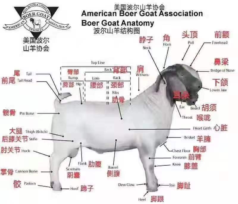 波尔山羊体型中等以上,体躯呈圆桶状。头部坚实,棕色双眼大而温驯,额突出鼻梁坚挺稍带弯曲;耳大下垂,长度超过头长。颈部与体躯、前肢结合良好,肌肉丰富,胸宽且深,肋 骨开张,背腰宽厚平直,后駆宽长丰满,四肢强健、结构均称、高度适中。皮肤宽松,公羊颈部与胸部有明显皱褶,被毛短而有光泽,有少量绒毛,眼睑与无毛部有色素沉着,允许头部皮肤有一定数量的色斑。体躯被毛白色,头部和颈部为棕红色,额端到唇端有一条白色毛带。少数波尔山羊全身都为棕红色被毛。母羊有大而丰满的乳房,公羊有大而对称的睾丸。