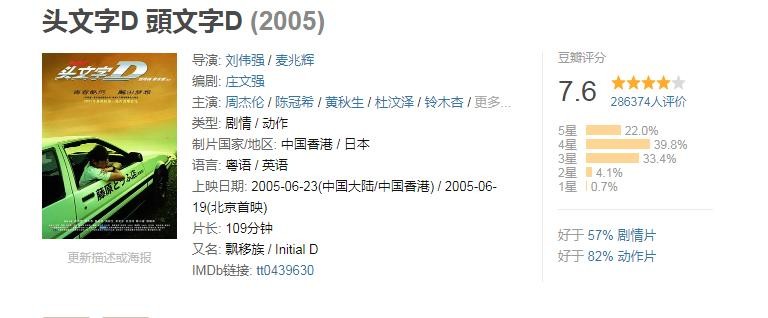 电影除了几次赛车也没什么大场面,故事也简单,但可以把它归结为剧情片,适合一个人安静的时候看。起初的时候评分较低,现在豆瓣评分7.6。