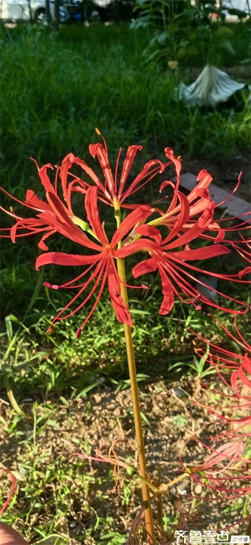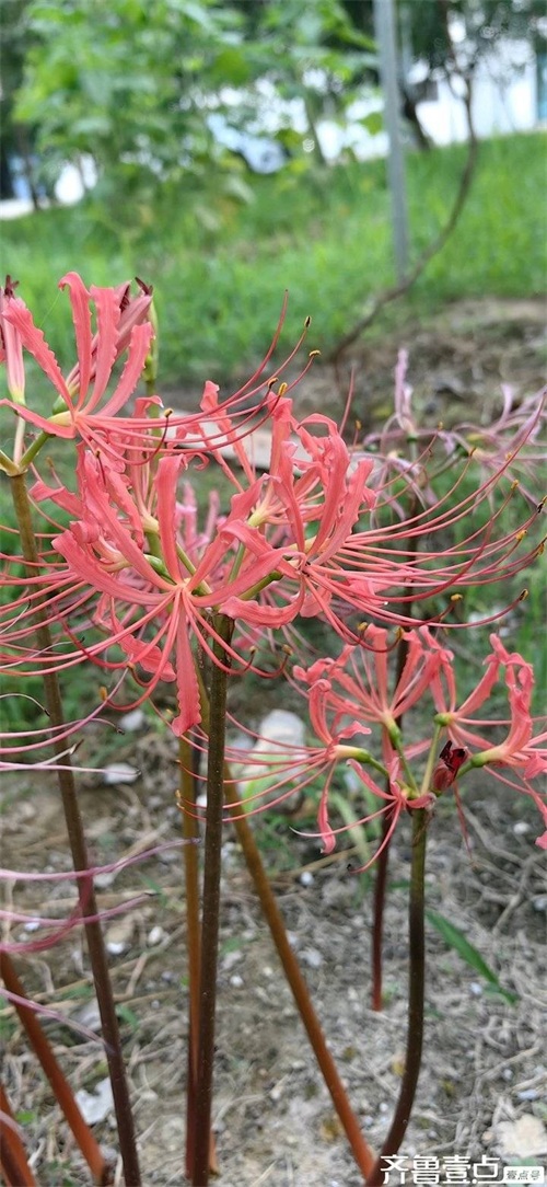 楼下就有这种花,是八年前到安徽仙寓山旅游带回的。当时住在七彩峡谷民宿,爱人在山上见有一种花开得很漂亮,就请教民宿老板,得知是石蒜花,就挖了几块根茎带回埋在了楼下。起初,也没有过多关注,并不知道此花的习性,也没有发现花自绽放,叶自生长的特点,也因时常不在家错过了时节,就忘了有这几棵花了。
