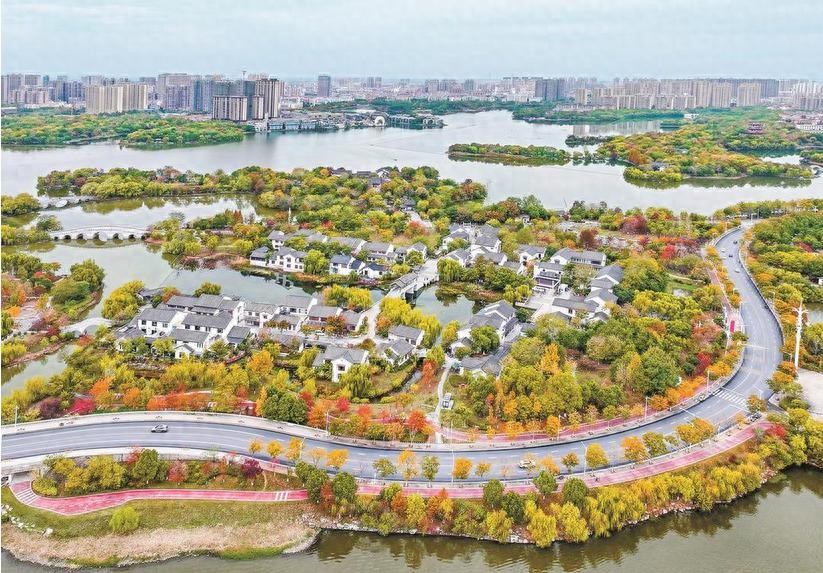 初冬时节,遗爱湖风景区景区、公园、街道披上色彩斑斓的“新衣”,绿的、黄的、红的多种色彩融合碰撞,层林尽染,如诗如画。图为11月26日,无人机拍摄的遗爱湖公园江柳摇村景区美丽画卷。记者 周伟 摄
