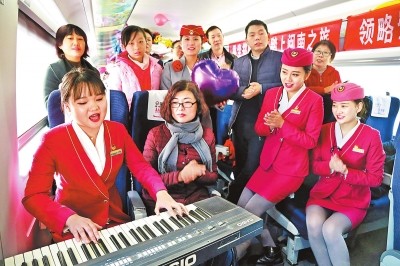 11月25日,郑州至厦门高铁列车正式开通,至此,列车运行时间由原来的23小时44分钟缩短为10小时39分钟,途经河南、湖北、江西、福建四省。图为乘务员为旅客送上精彩的节目。