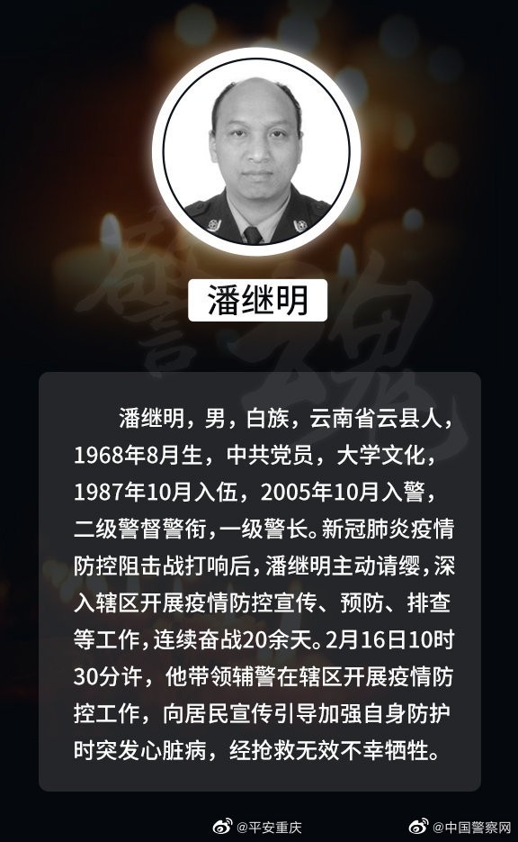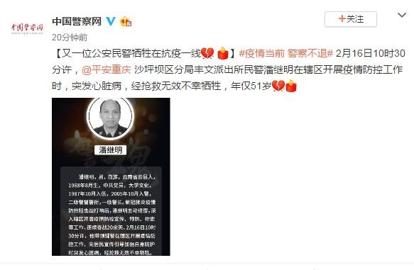 【又一位公安民警牺牲在抗疫一线】2月16日10时30分许,@平安重庆 沙坪坝区分局丰文派出所民警潘继明在辖区开展疫情防控工作时,突发心脏病,经抢救无效不幸牺牲,年仅51岁。