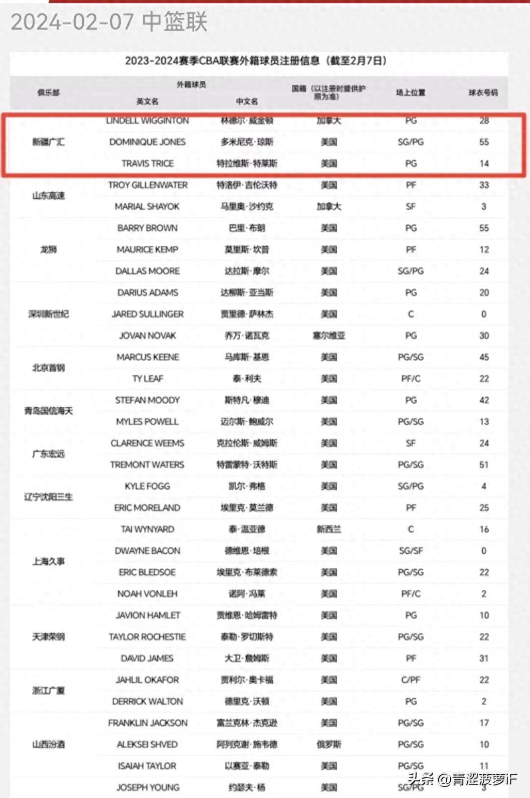 2024年2月9日,在CBA官网更新的外籍球员注册信息表中,新疆广汇俱乐部已经有了三名外籍球员。