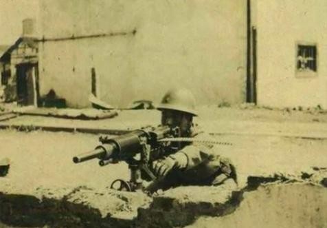 图为准备屠杀百姓的日军士兵,手持重型机枪的他准备扫射中国百姓。