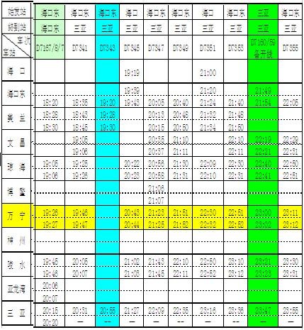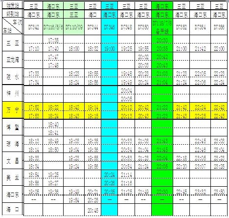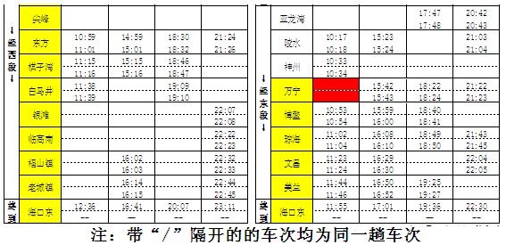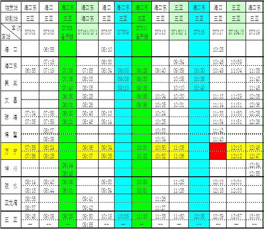 (注:绿色为凭调度命令开行列车,蓝色为直达列车,红色为本站(万宁)通过列车,浅绿色为环岛列车)