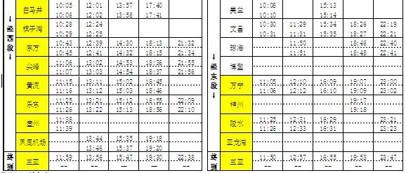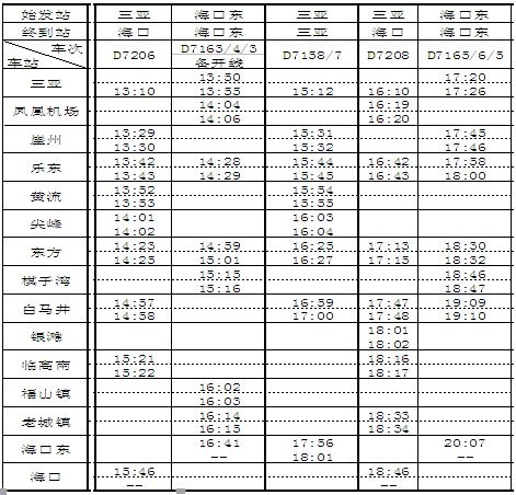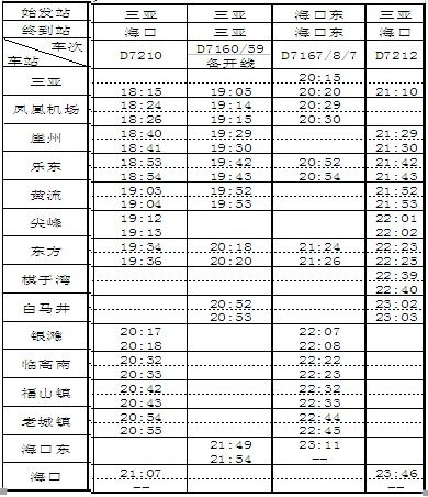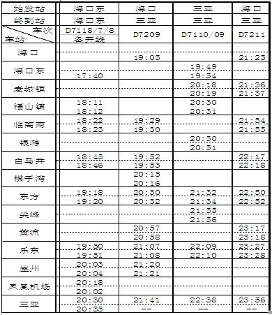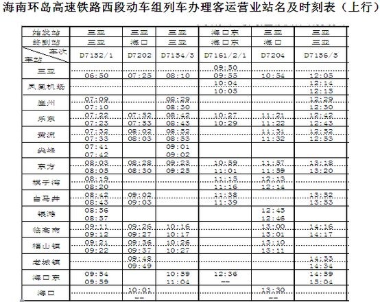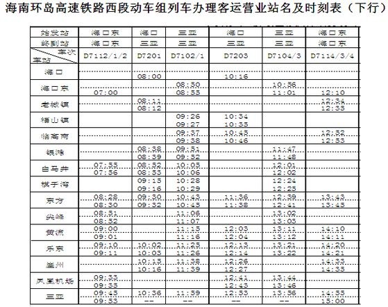 海南环岛高速铁路东段动车组列车办理客运营业站名及时刻表(下行)