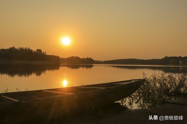 夕阳正斜照在空阔的水面上,曲折的小岛连接翠绿的群山。